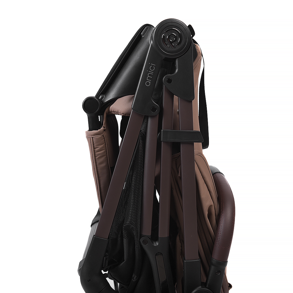 · При складывании специальные стойки направляют передние колеса в положение «прямо». За счет этого коляска устойчиво стоит в сложенном виде;