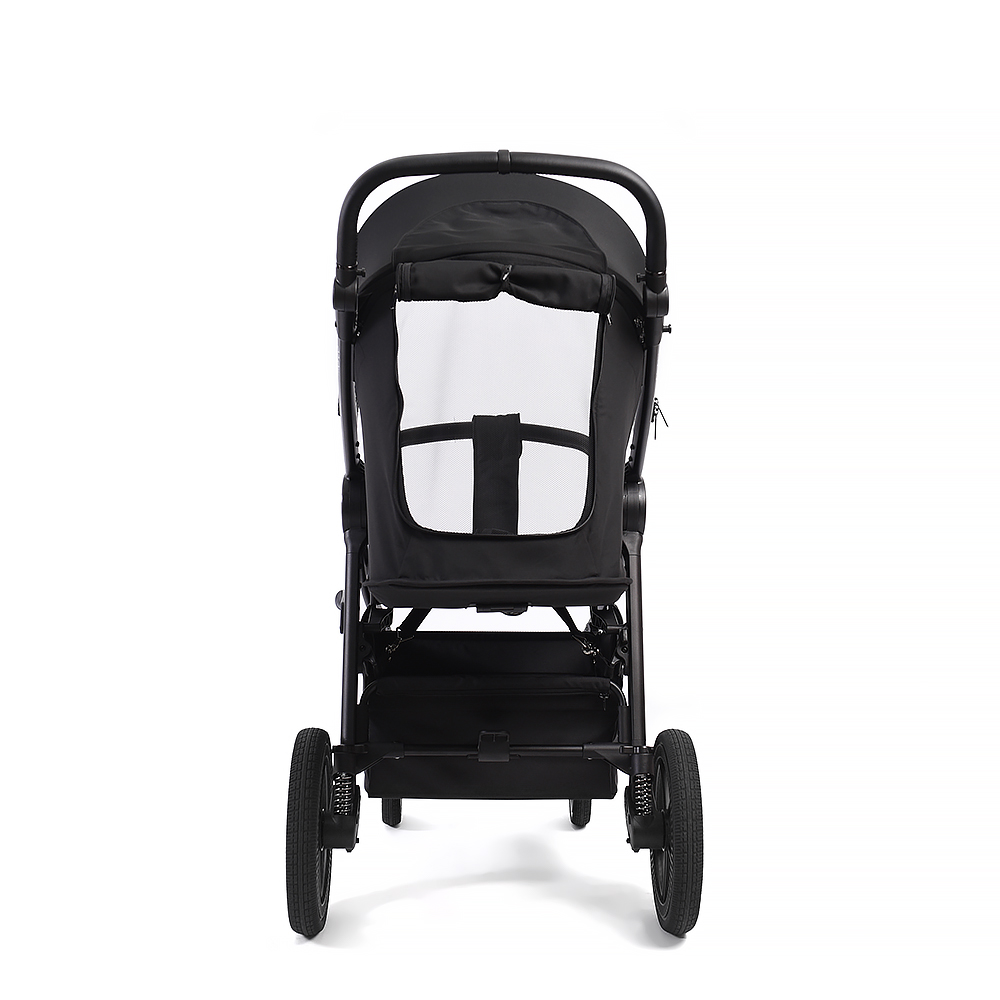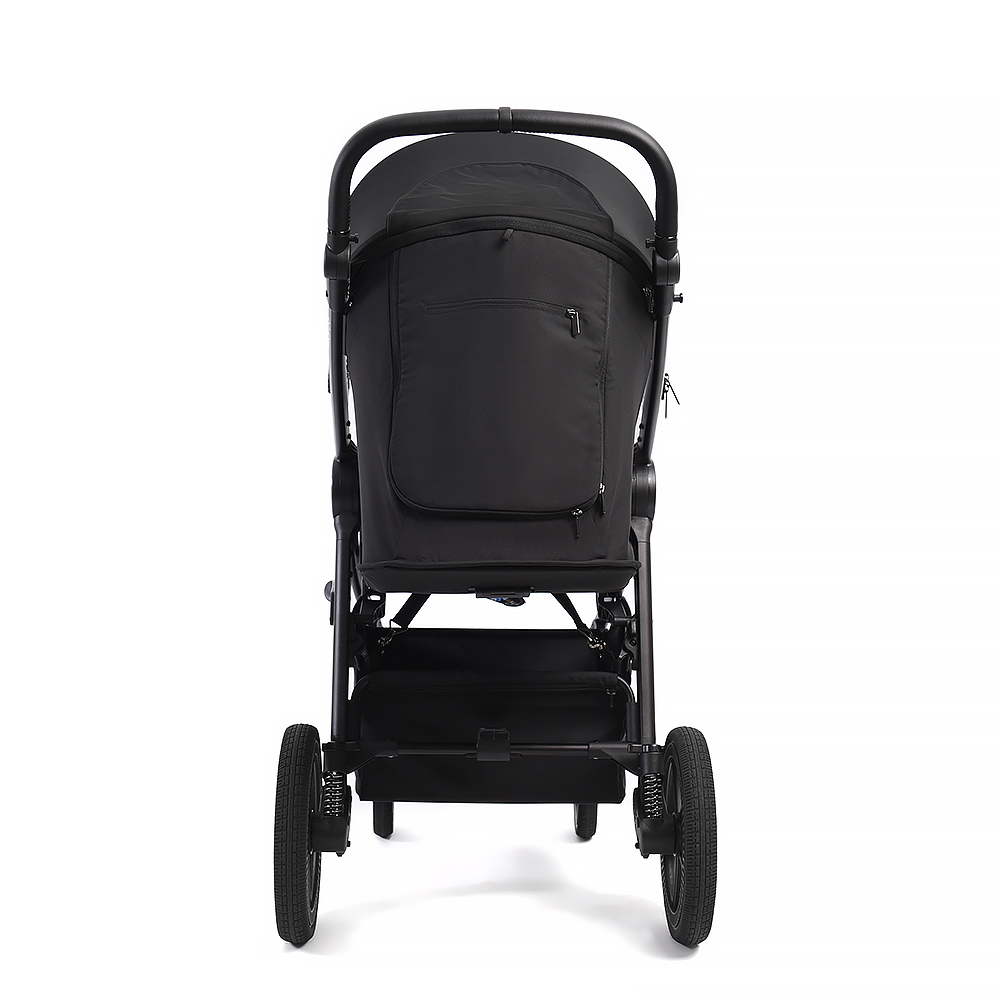 Удобству передвижения способствует пружинная регулируемая амортизация и большие резиновые колеса – коляска спокойно преодолевает неровную дорогу и неглубокий снег!