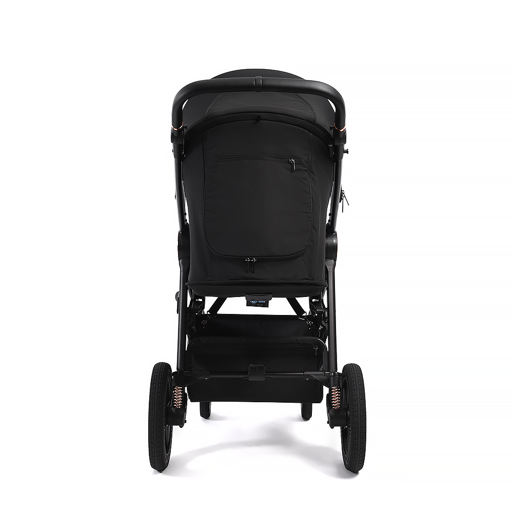 Удобству передвижения способствует пружинная регулируемая амортизация и большие резиновые колеса – коляска спокойно преодолевает неровную дорогу и неглубокий снег!