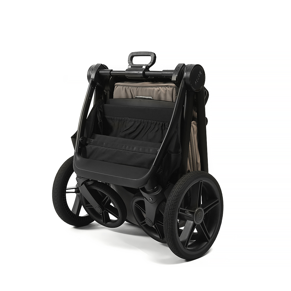 • Шасси складывается с помощью ручки над корзиной. Складывание рамы с прогулочным блоком возможно в любом направлении.