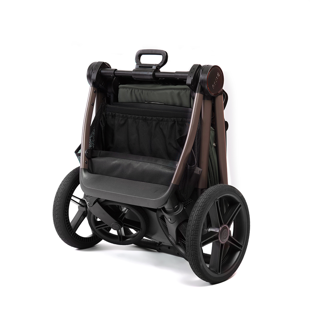 • Шасси складывается с помощью ручки над корзиной. Складывание рамы с прогулочным блоком возможно в любом направлении;