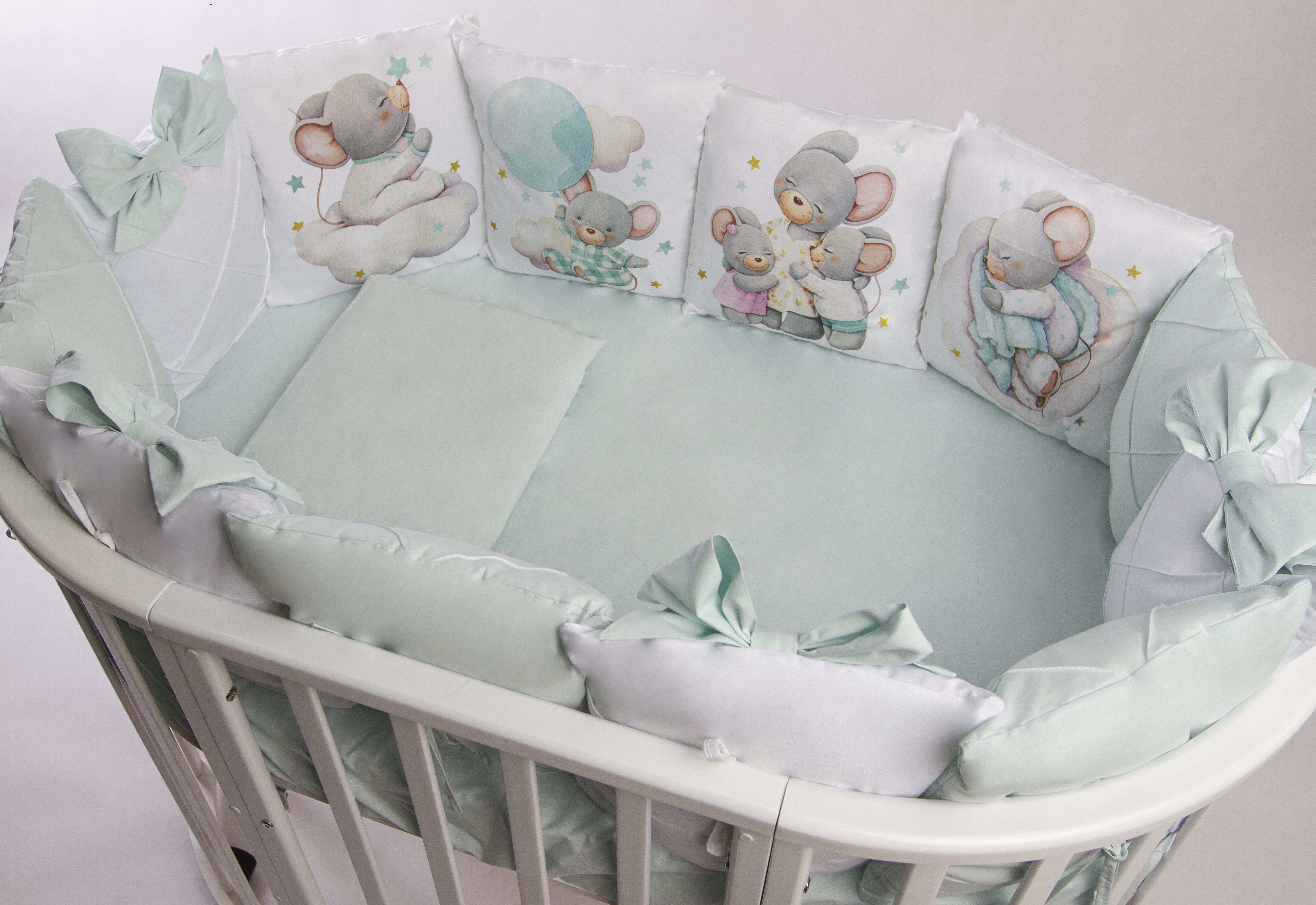 ✔️ Подходит для любых детских кроваток: круглой, овальной, прямоугольной (120х60 см) благодаря простыне на резинке.