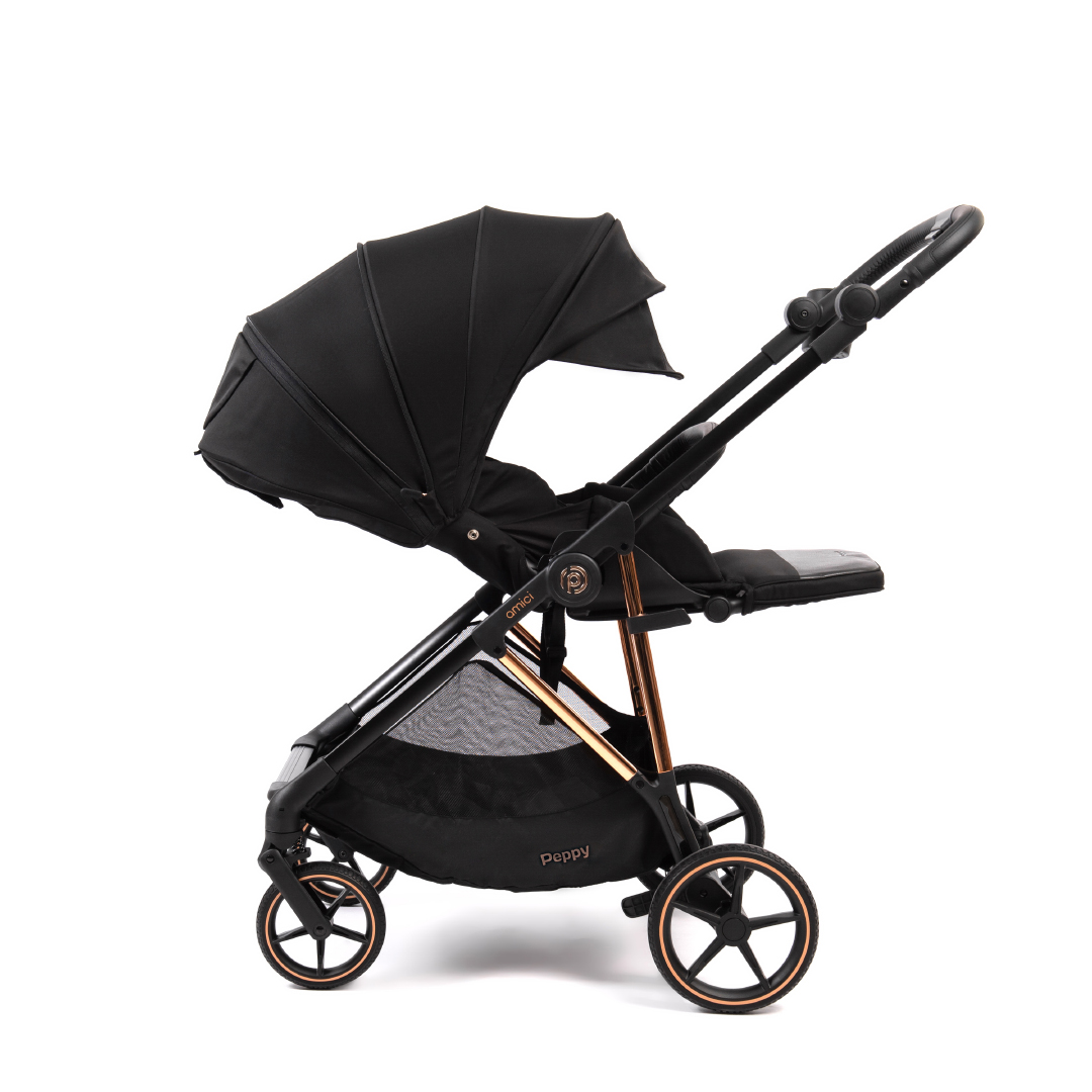 Прогулочная коляска Peppy Amici - легкая и маневренная модель с реверсивным блоком. Блок сиденья можно установить лицом к маме, чтобы малыш чувствовал себя комфортно и безопасно, либо лицом вперед для наблюдения за окружающим миром!