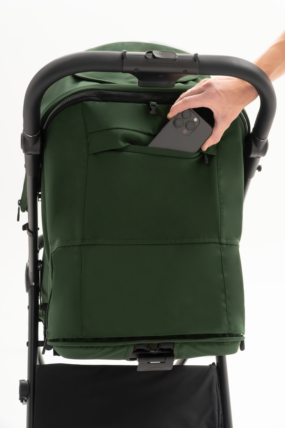 · Ручка из экокожи и регулируется по высоте в 5 положениях. На ней расположена кнопка складывания и защитные ножки, на которых стоит коляска в сложенном виде. При этом сама ручка не касается земли и остается чистой;