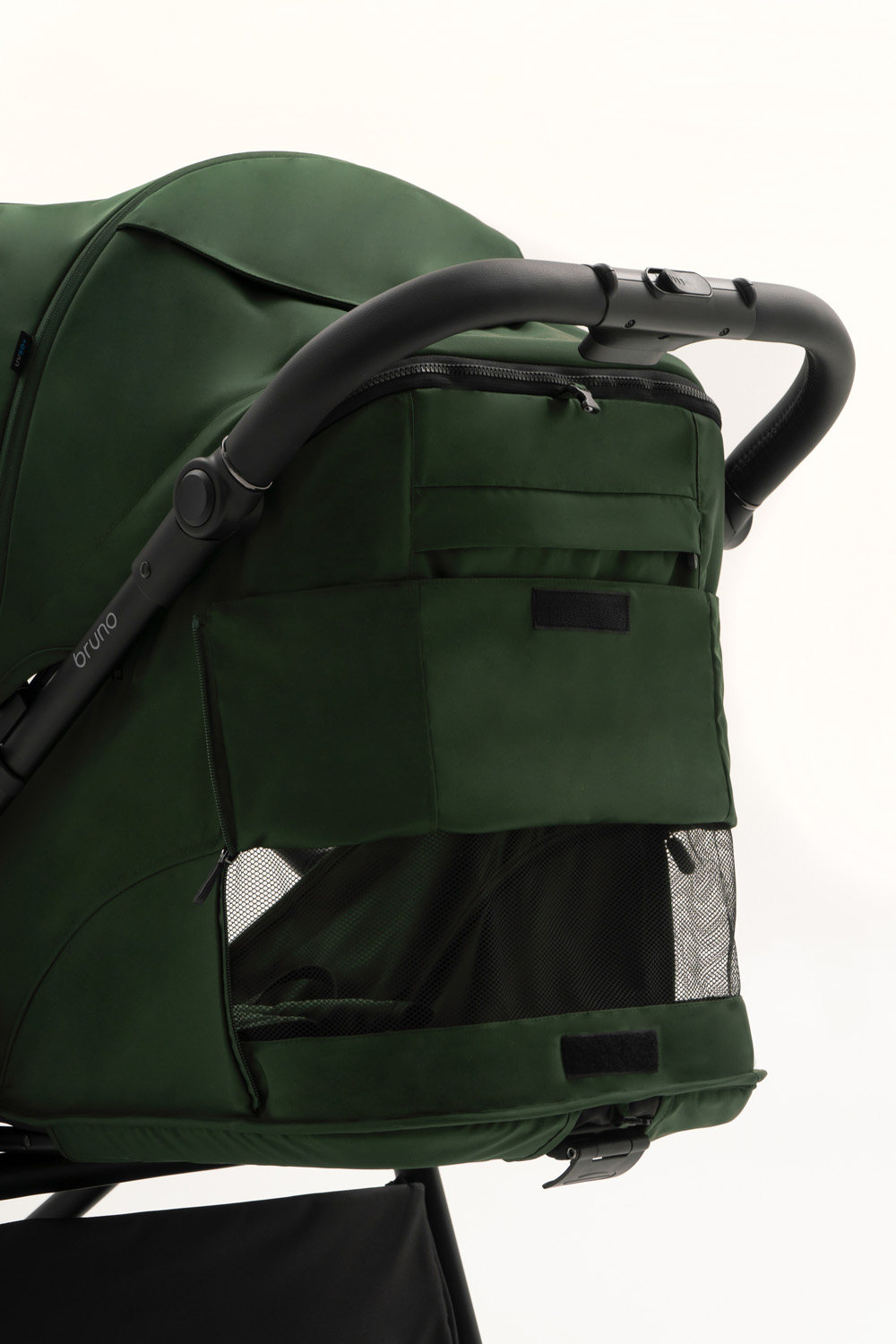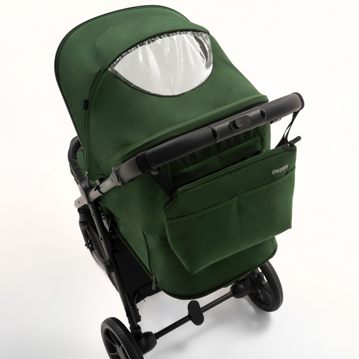 В жаркую погоду задняя секция капора поднимается для проветривания. Москитная сетка (в комплекте) при необходимости всегда под рукой – в специальном кармашке под подножкой.