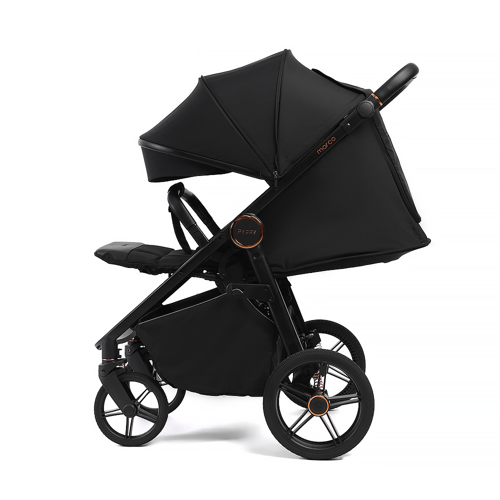 Peppy Marco – всесезонная коляска идеально подходит для прогулок в любое время года! Коляска хорошо защищает малыша от непогоды и сильного ветра, благодаря глубокому капюшону и теплой накидки на ножки, которая не оставляет щелей.