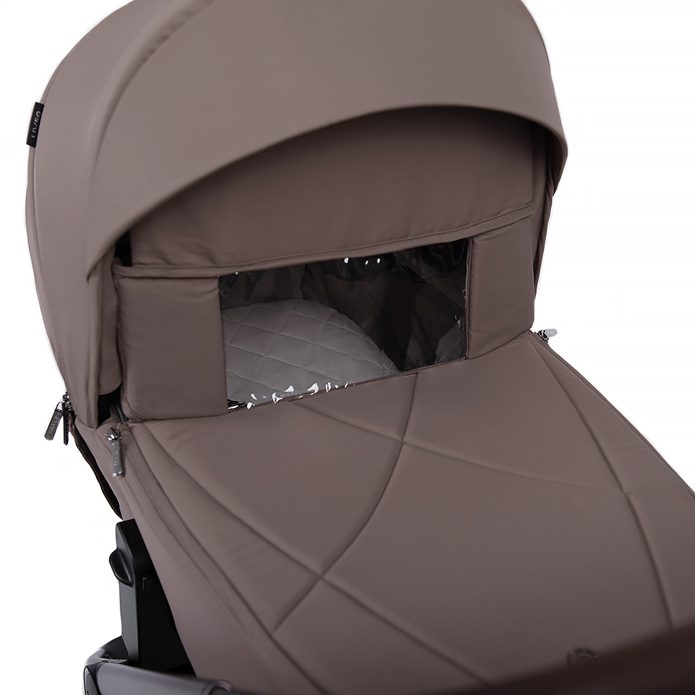 • Дополнительная секция проветривания и смотровое окошко в капюшоне люльки;