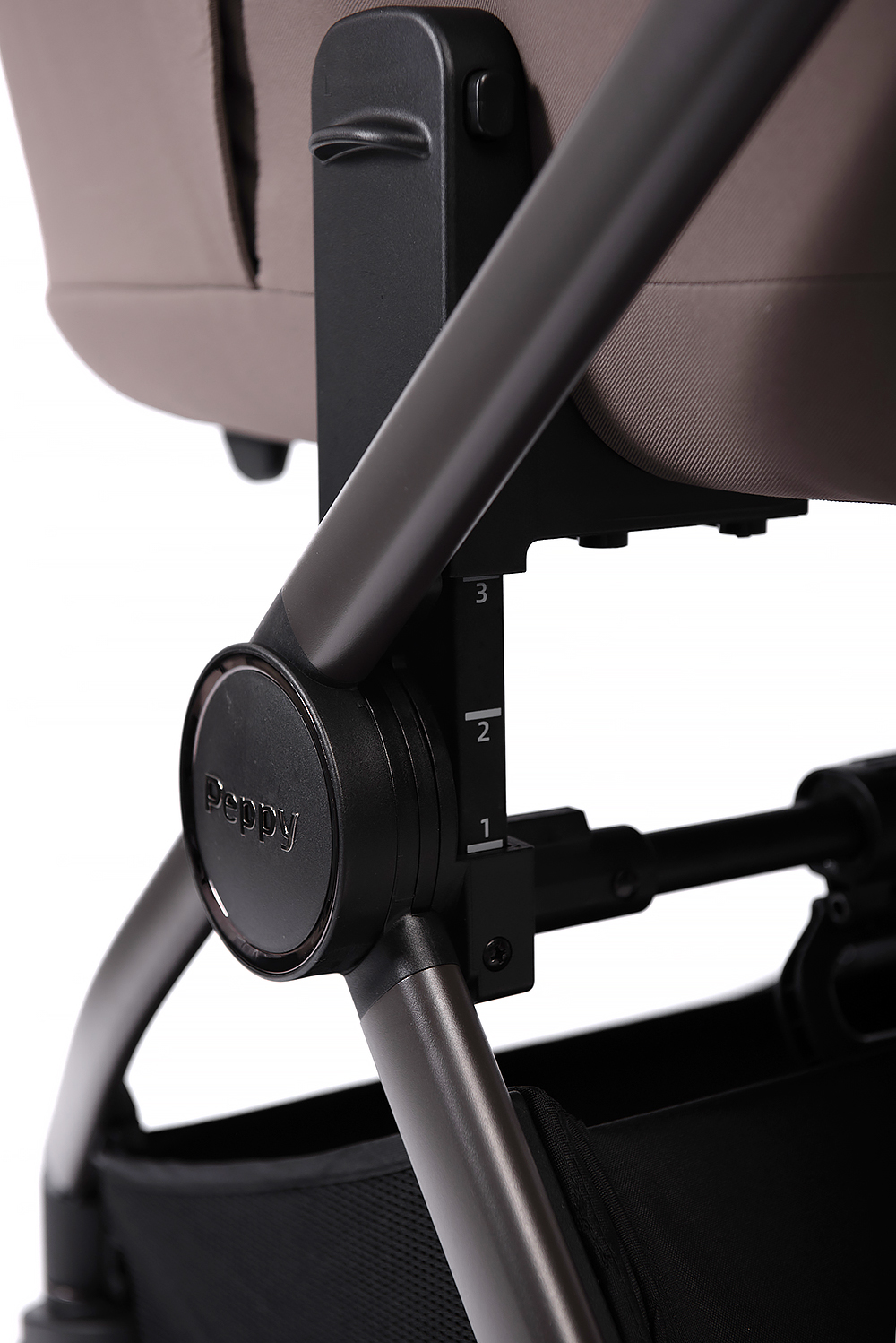• Простая установка люльки на шасси - широкие адаптеры легко и плавно фиксируются на раме и регулируются в трех положениях по высоте. А для снятия её достаточно нажать одну кнопку с эффектом памяти и потянуть ручку вверх.