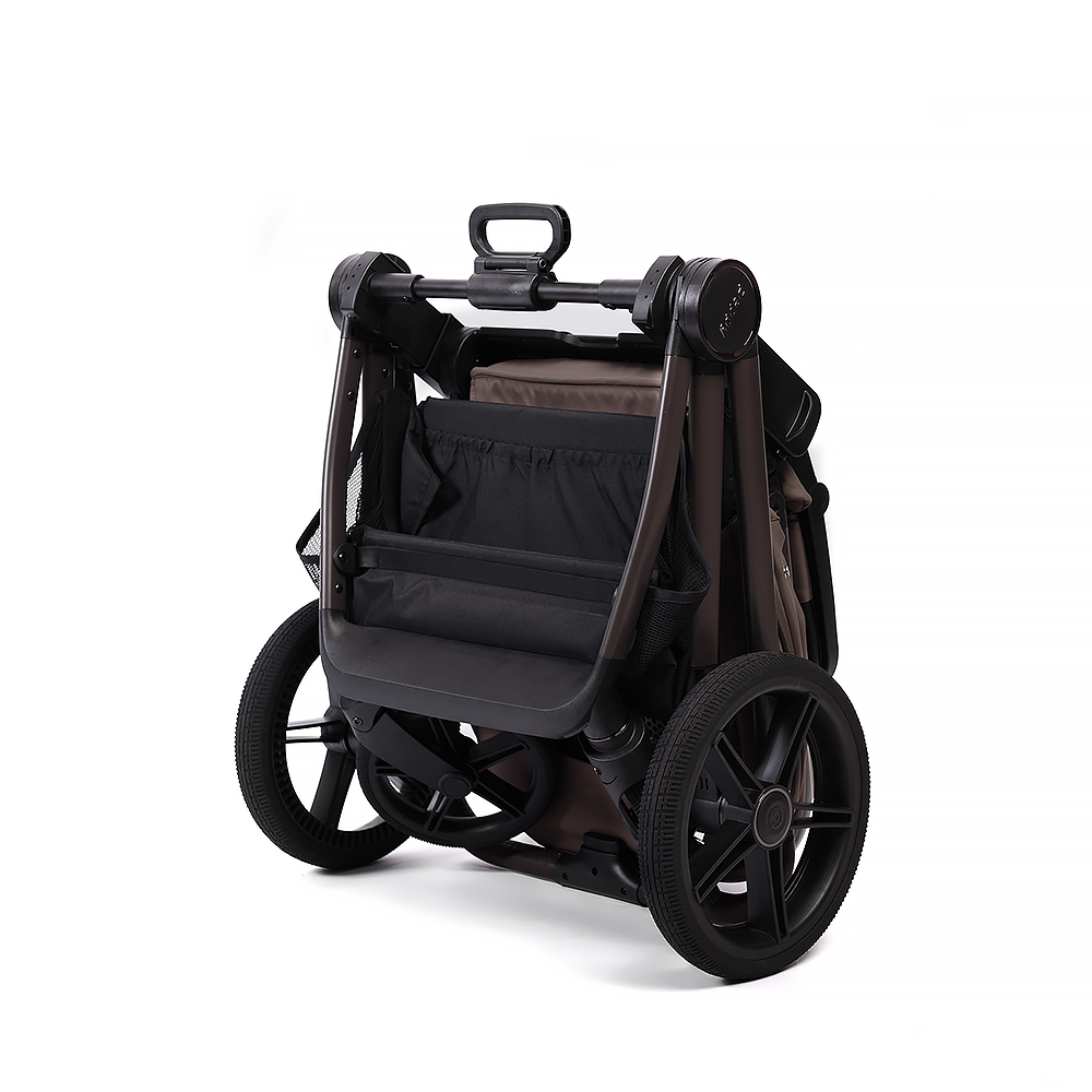 • Шасси складывается с помощью ручки над корзиной. Складывание рамы с прогулочным блоком возможно в любом направлении;